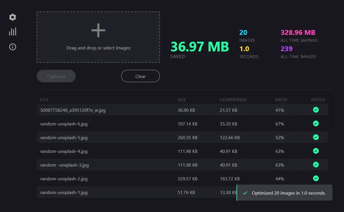 Optimus - приложение для оптимизации изображений. Он поддерживает конвертацию и сжатие изображений между форматами WebP, JPEG и PNG.